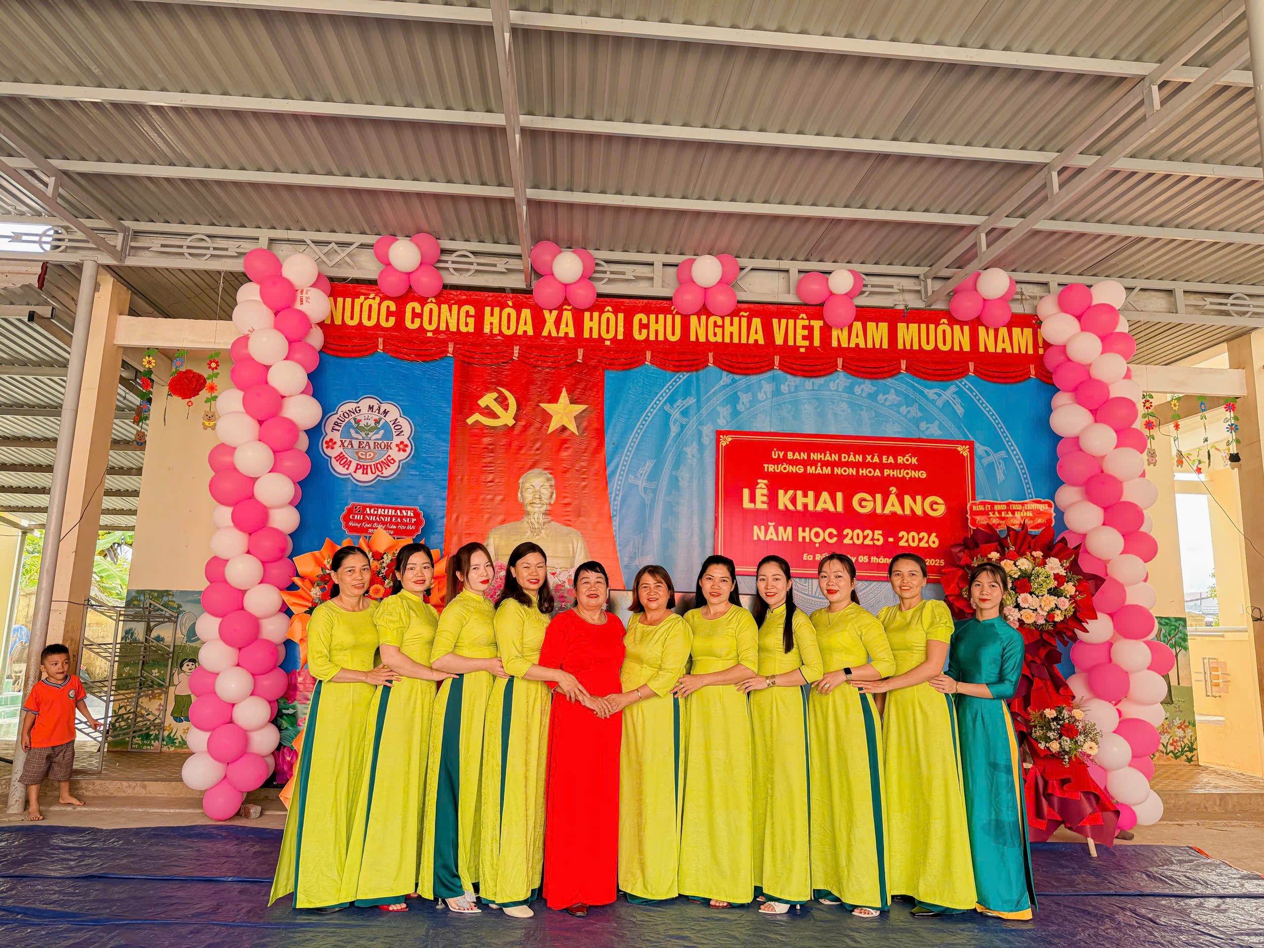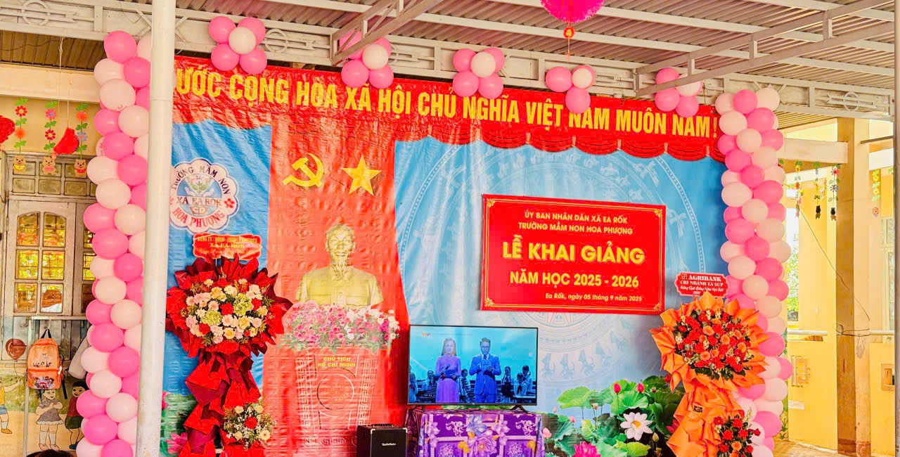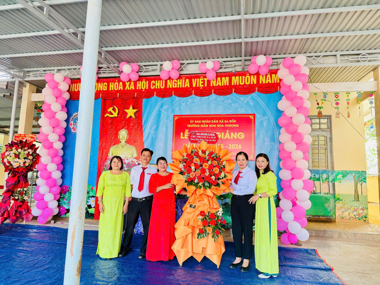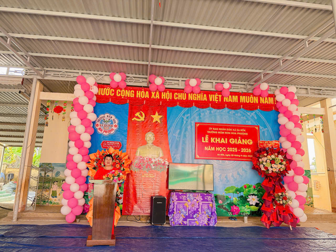 Về dự lễ khai giảng năm học 2025-2026 của Trường mầm non Hoa Phượng có sự tham gia của quý vị đại biểu và các vị khách quý. Về phía chính quyền địa phương có sự tham gia của ông Cao Thanh Phi – Chỉ huy trưởng ban chỉ huy quân sự xã Ea Rốk. Về phía nhà trường có sự tham gia của bà Đặng Thị Thu – Bí Thư chi bộ – Hiệu trưởng nhà trường; bà : Trần Thị Thêm – Phó Bí thư chi bộ PHT CSVC bán trú nhà trường; bà : Nguyễn Thị Bình – PHT phụ trách chuyên môn nhà trường. Về phía Hội phụ huynh học sinh tôi trân trọng giới thiệu sự hiện diện của Ông Lương Gia Long là Hội Trưởng BĐDCMHS; Bà Đinh Thị Mỹ Hạnh là Hội Phó BĐDCMHS. Về dự cùng nhà trường có đại diện của Ngân hàng Agribank Ea Súp cùng toàn thể giáo viên- nhân viên và các em học sinhcủa nhà trường.