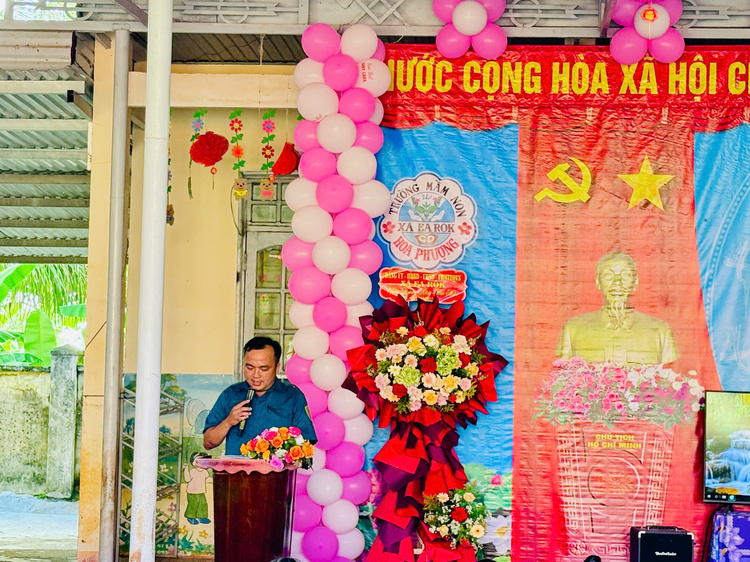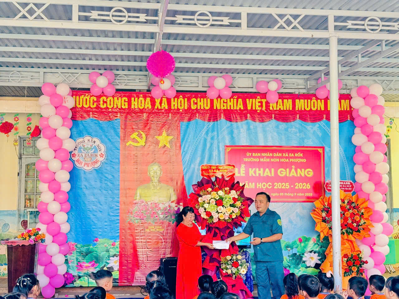Tiếp theo chương trình ông Cao Thanh Phi – Chỉ huy trưởng Ban chỉ huy quân sự xã Ea Rốk, lên phát biểu ý kiến , gửi gắm những tình cảm và niềm tin tới cô và trò nhà trường trong năm học mới và tặng cho nhà trường lăng hoa tươi thắm.